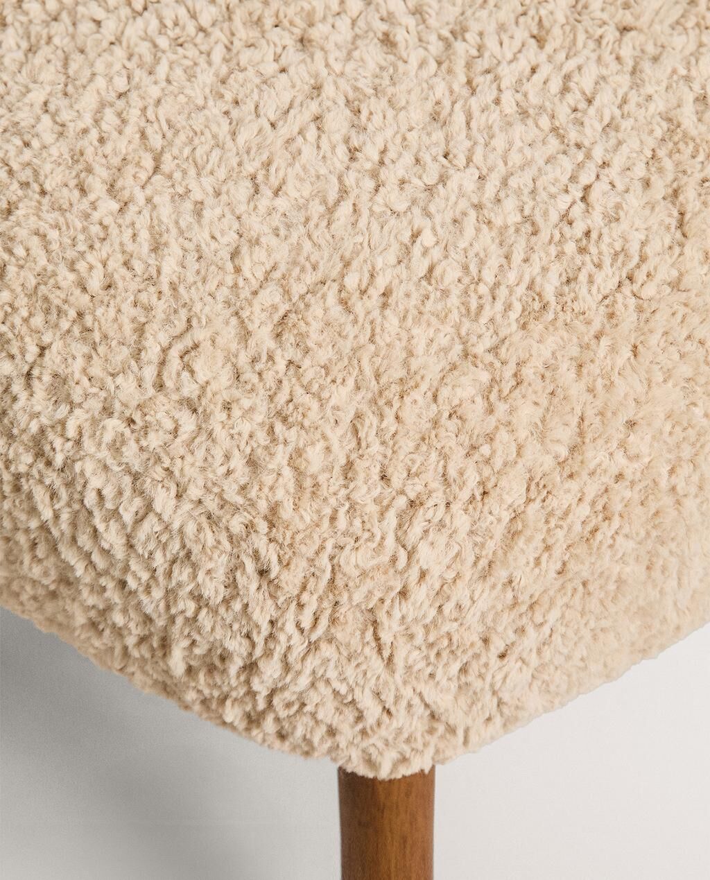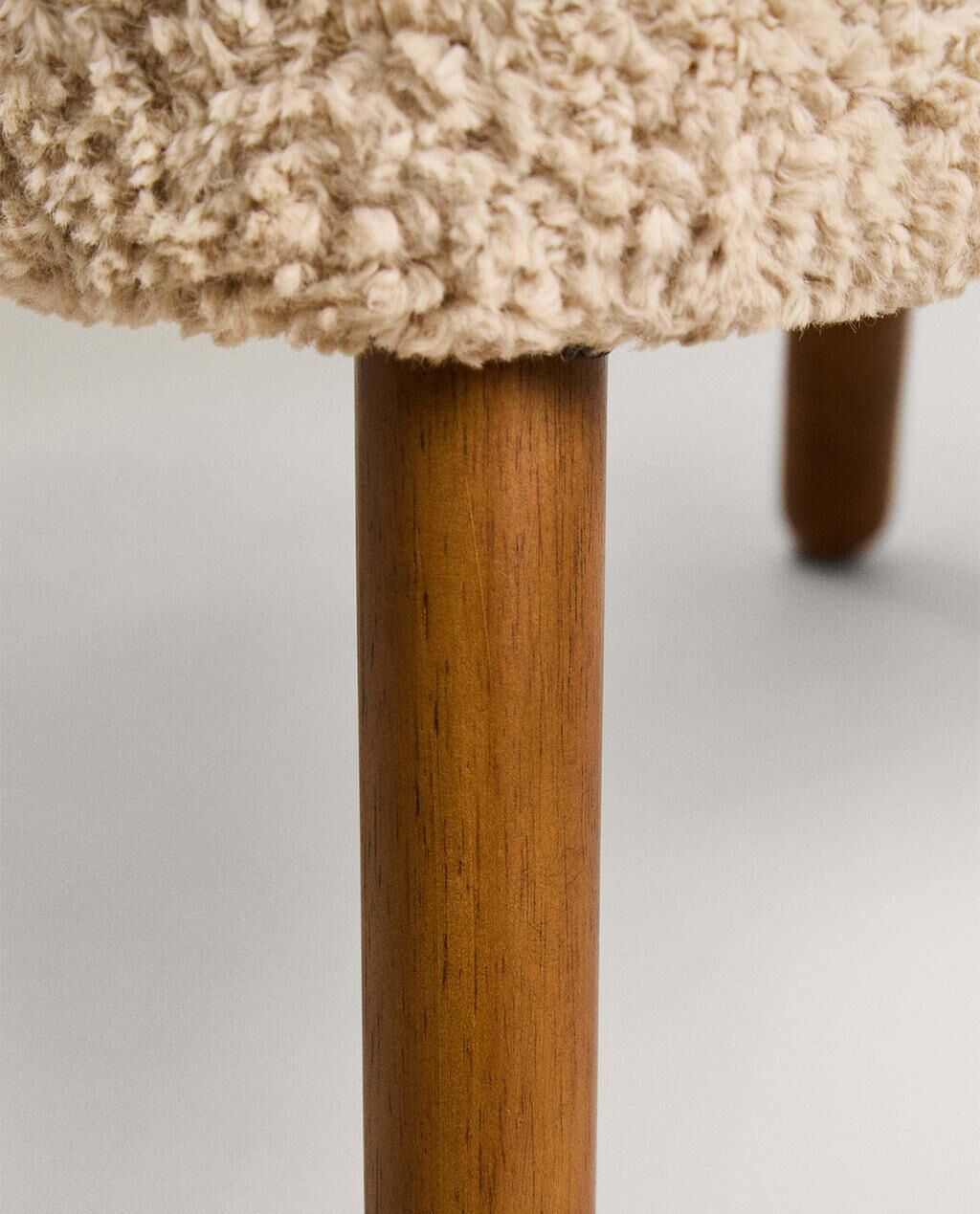 Bej rengi kıvırcık pelüş döşemeli ayak uzatma taburesi.