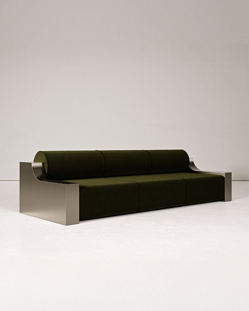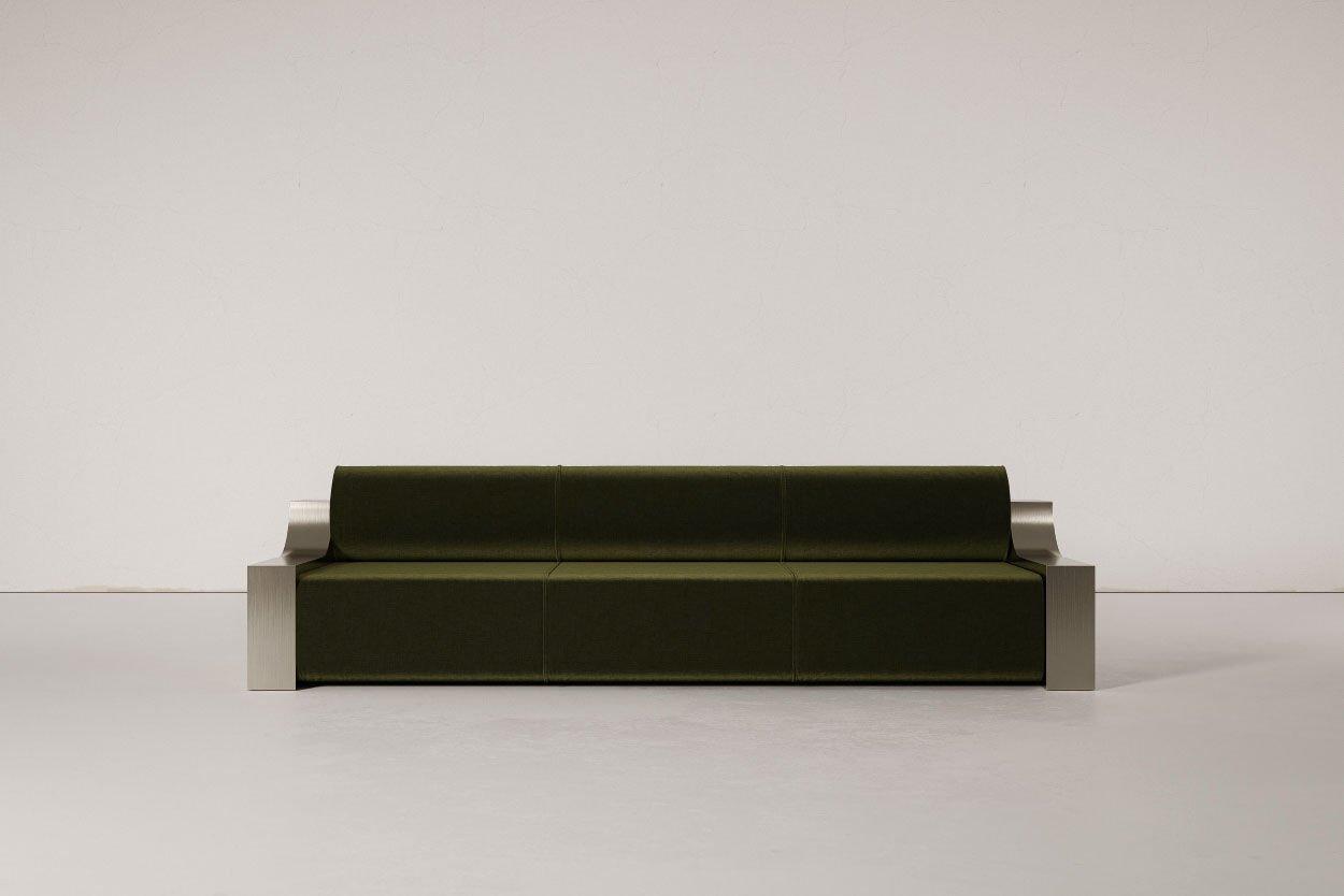 Paslanmaz Çelik Üçlü Koltuk | Mimari Form 314 cm genişliğinde fırçalanmış paslanmaz çelik gövde ve lüks C&C Milano kadife döşeme. Geniş lounge ve lobi alanları için heykelsi bir tasarım. L-2026019402 Paslanmaz Çelik Üçlü Koltuk | Mimari Form