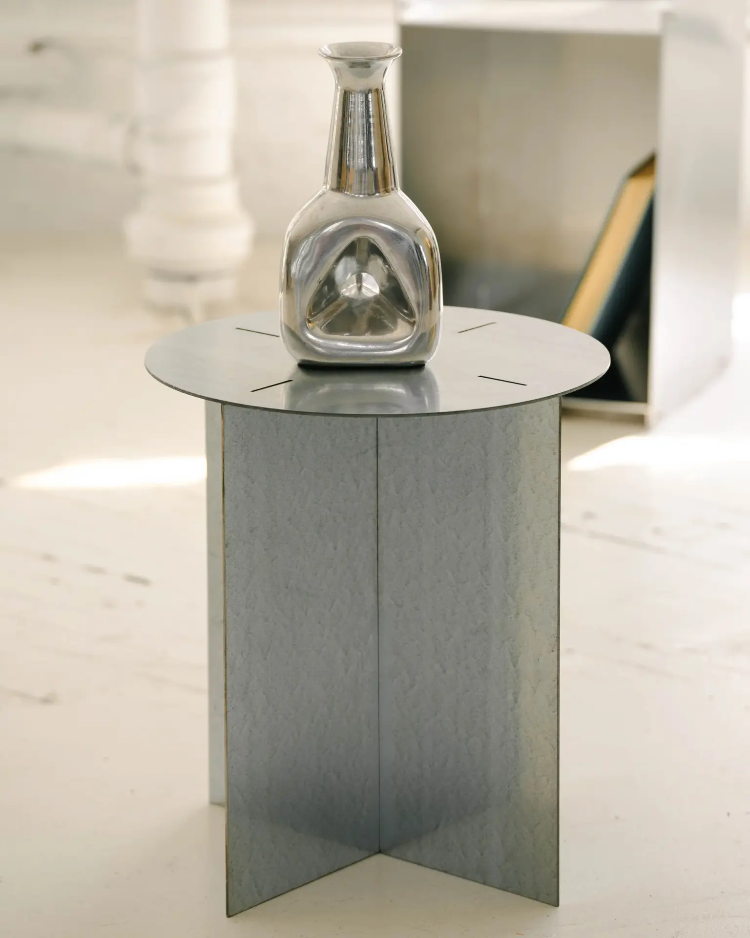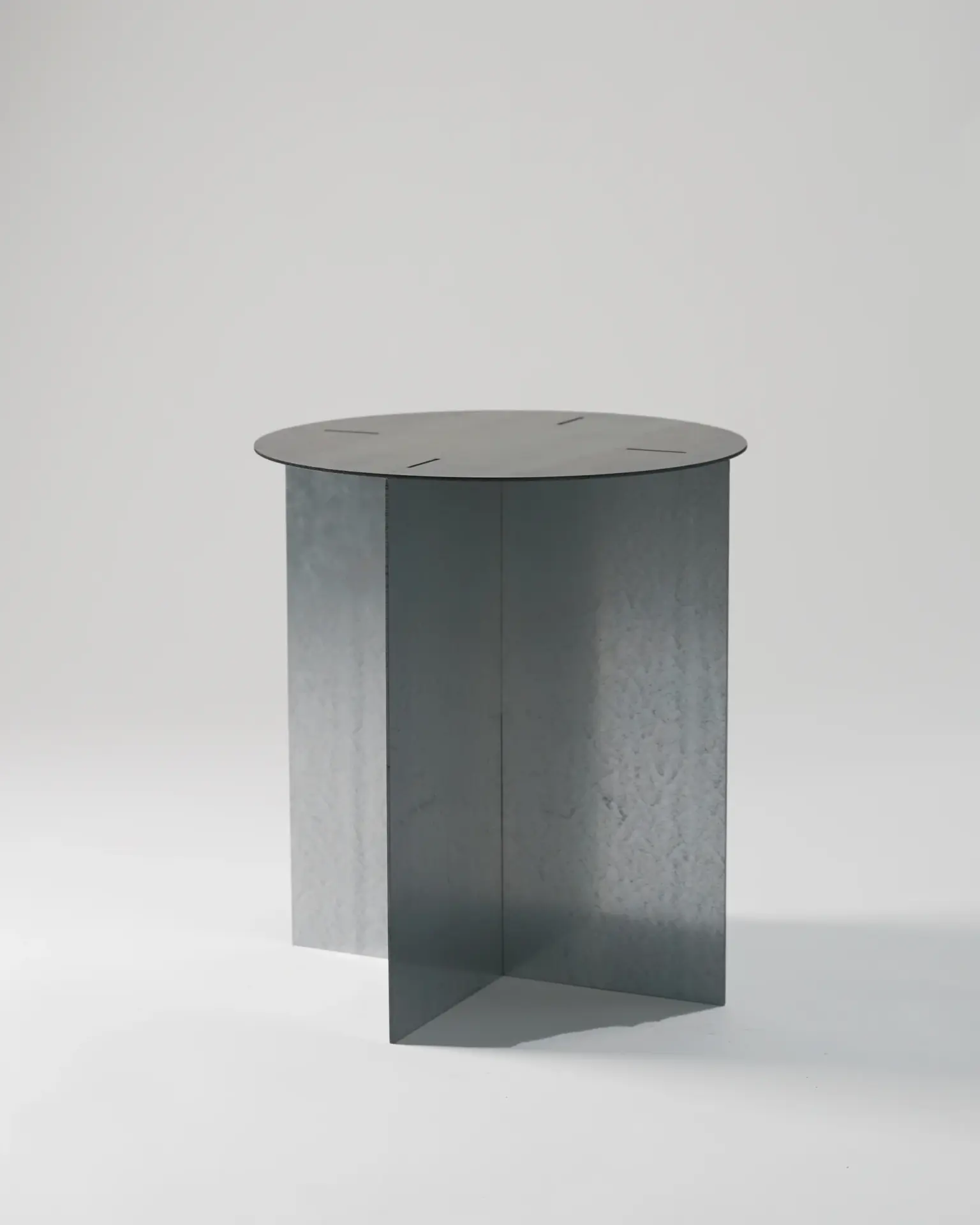 Ürün, yapısal sağlamlığıyla bilinen galvanizli çelikten üretilmiştir. Üretim sürecinin doğası ve malzemenin kimyası gereği her bir sehpanın yüzeyi tamamen benzersiz bir dokuya sahiptir. Bu ham ve organik bitiş, serileştirilmiş kusursuzluğa karşı durarak tasarıma otantik bir yaşanmışlık katar.